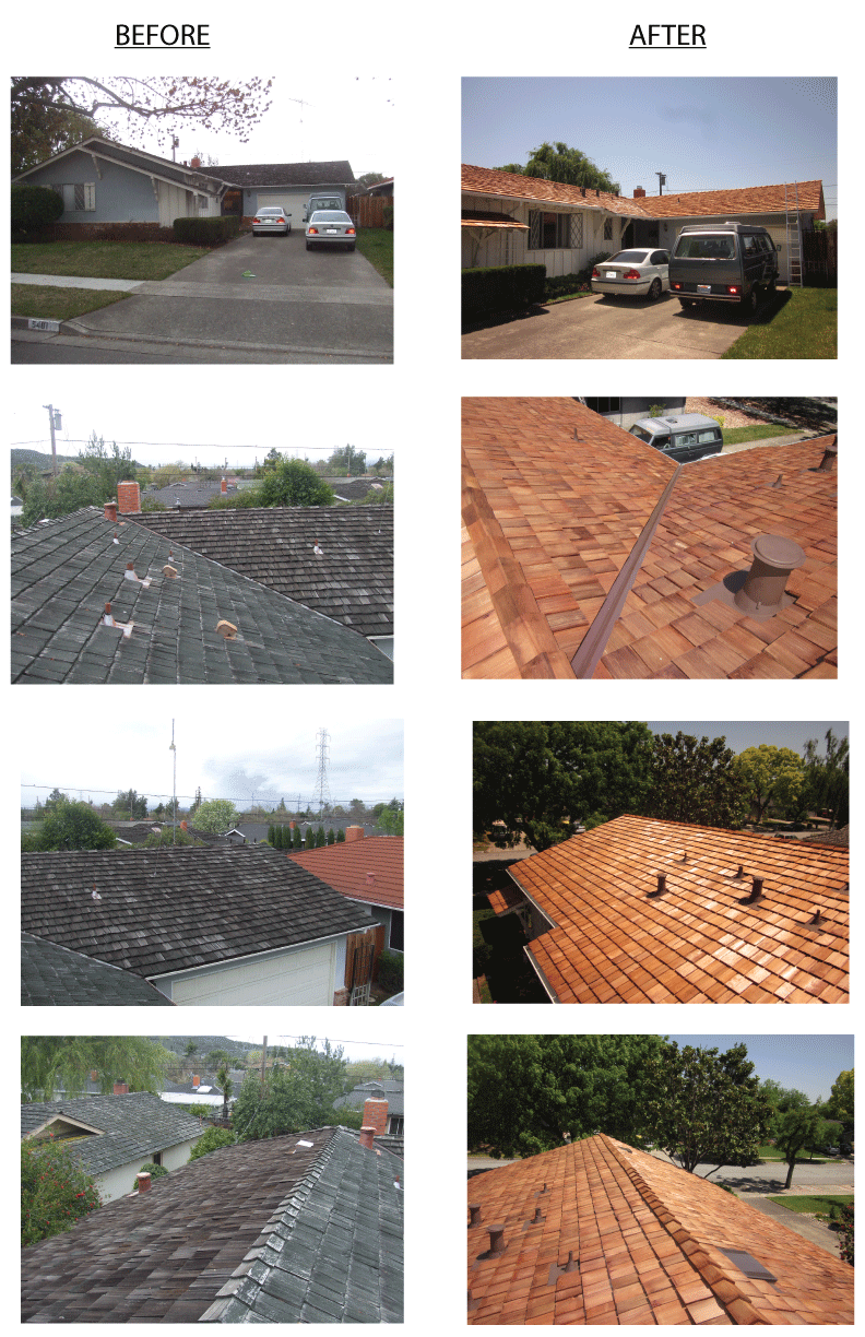 The before pictures in this gallery show curled and cupped shakes and exposed felt underlayment. This roof system had outlived its useful life and was in need of replacement. We replaced the existing roof with Class B fire retardant shake which is up to code with newer standards. Older cedar shakes were not required to be fire rated, so this new roof gave the homeowner better peace of mind as well as a more aesthetic appeal.